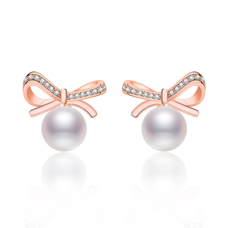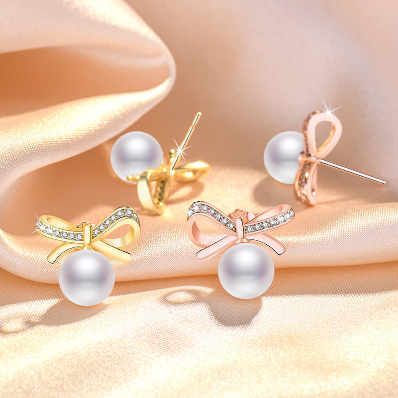 Women's Style Rhinestone Bow Freshwater Pearl Vitality Earrings