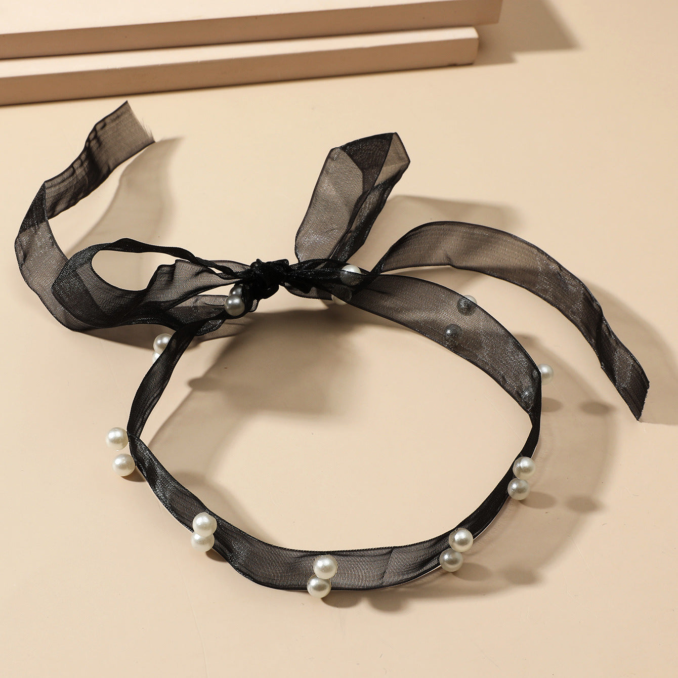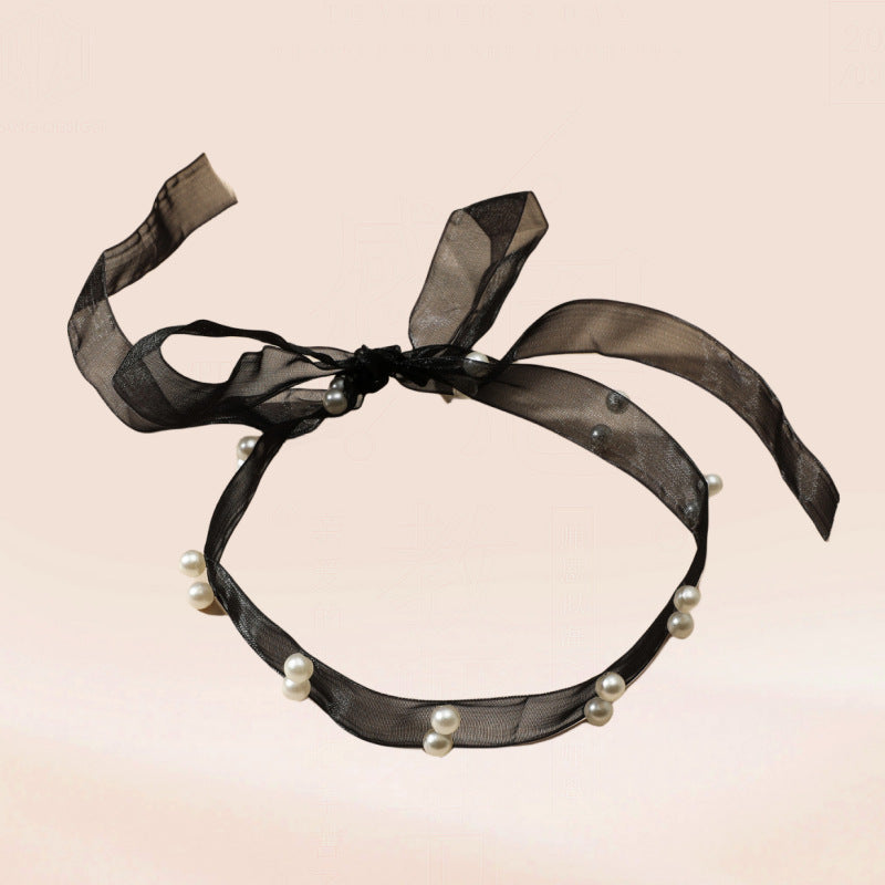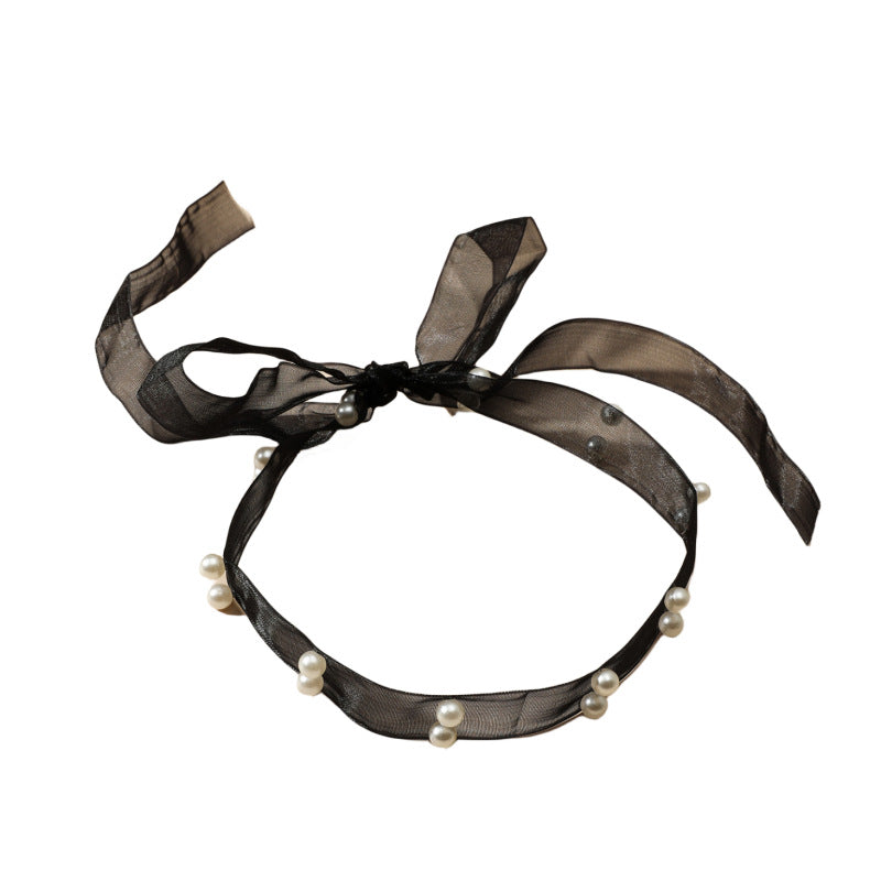 Women's Sweet Lady Black Mesh Ribbon Pearl Necklaces